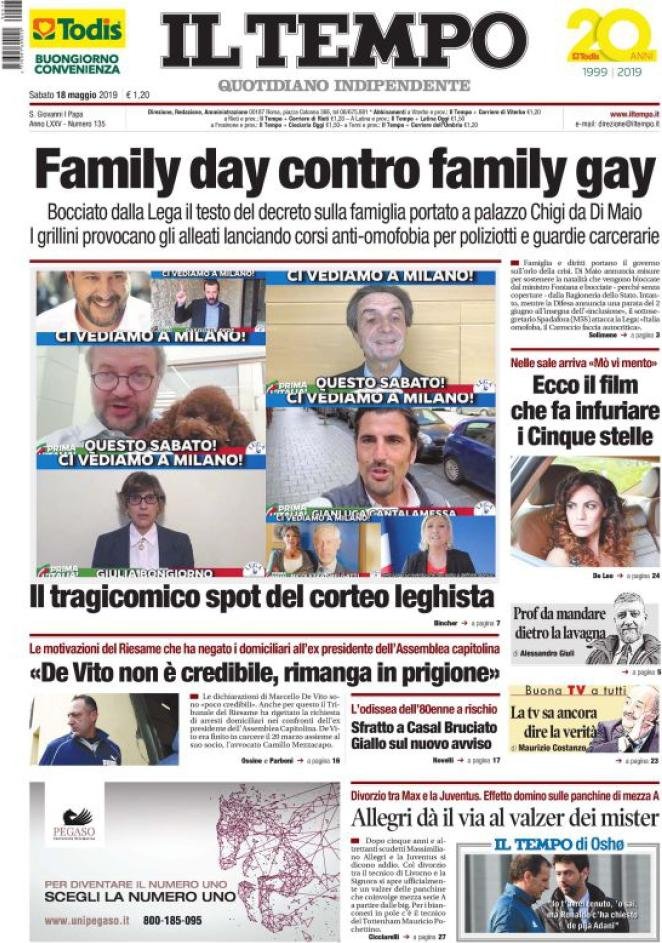 Rassegna delle prime pagine dei principali giornali italiani in edicola di oggi 18 maggio 2019