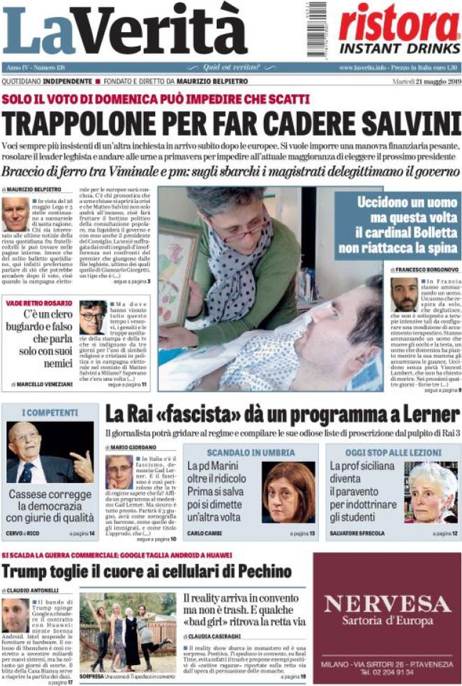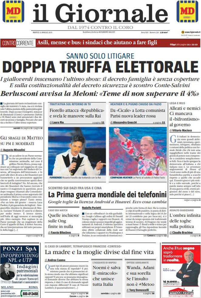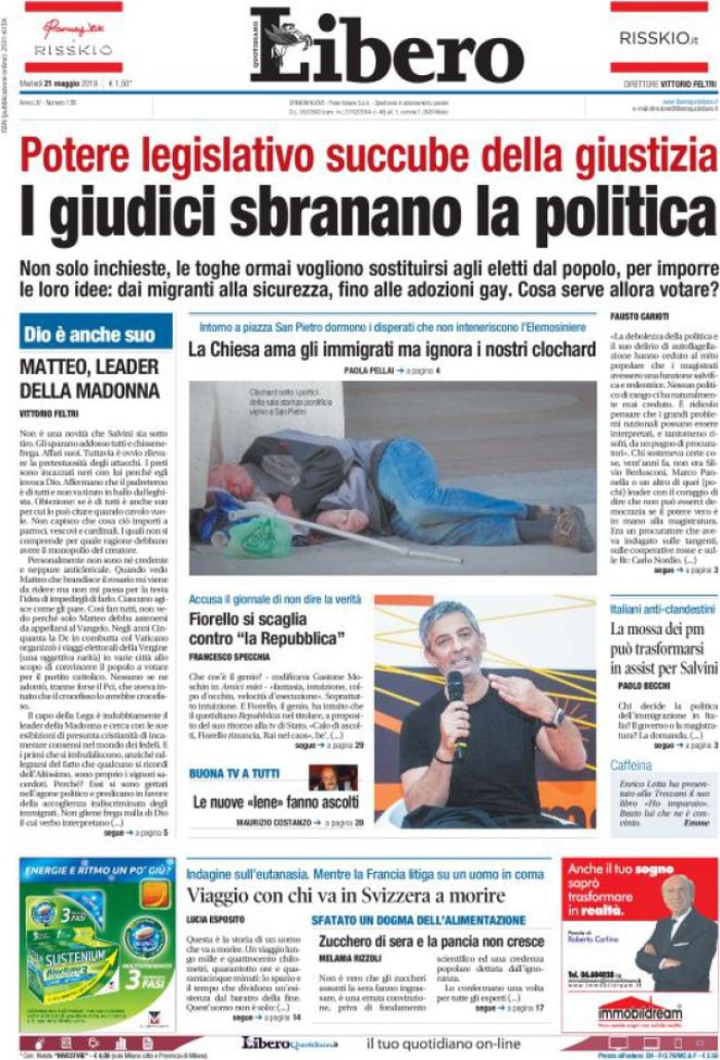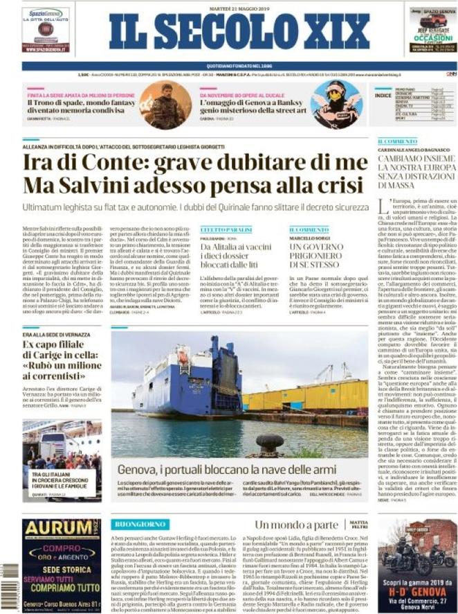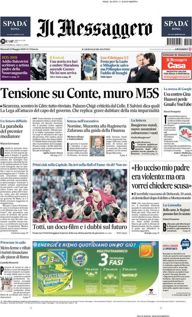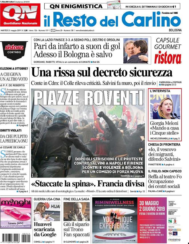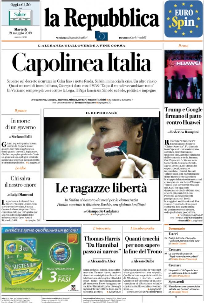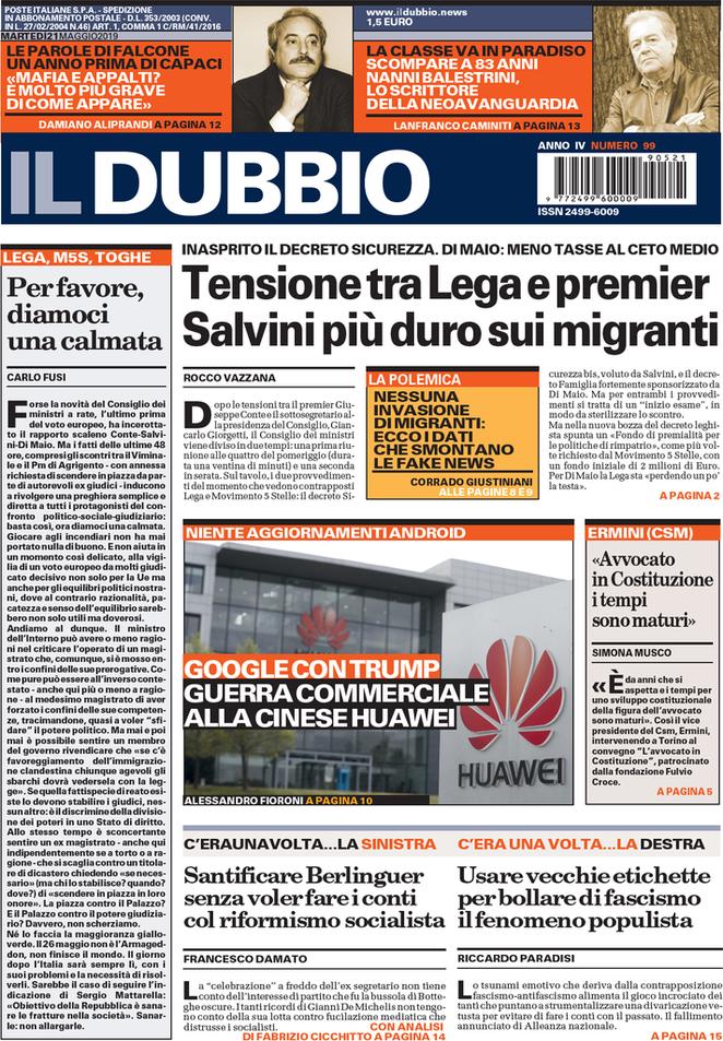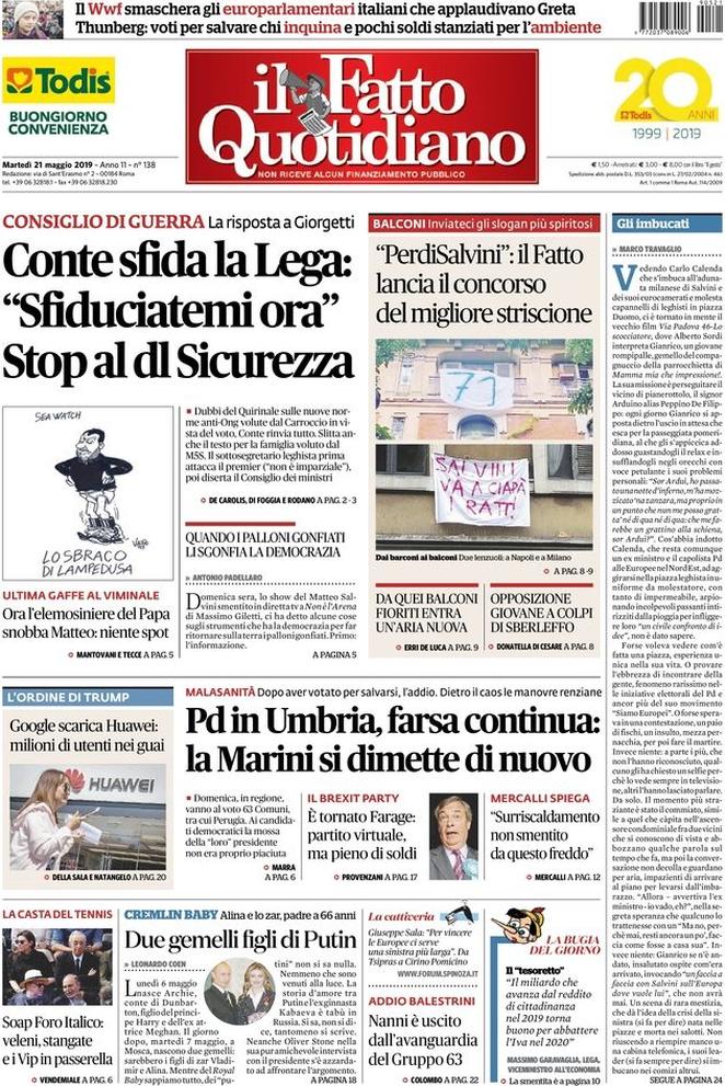 Rassegna delle prime pagine dei principali giornali italiani in edicola di oggi 21 maggio 2019