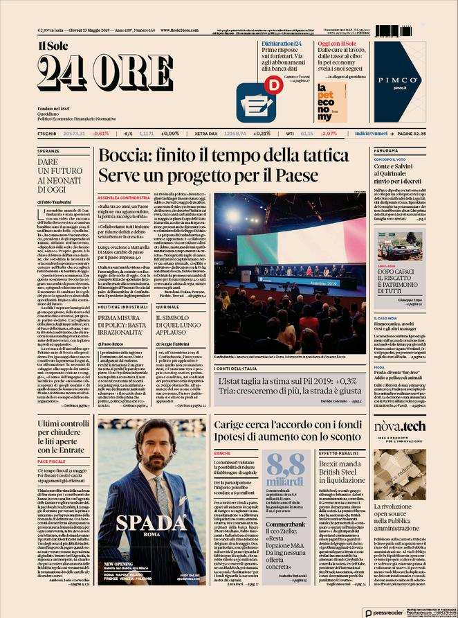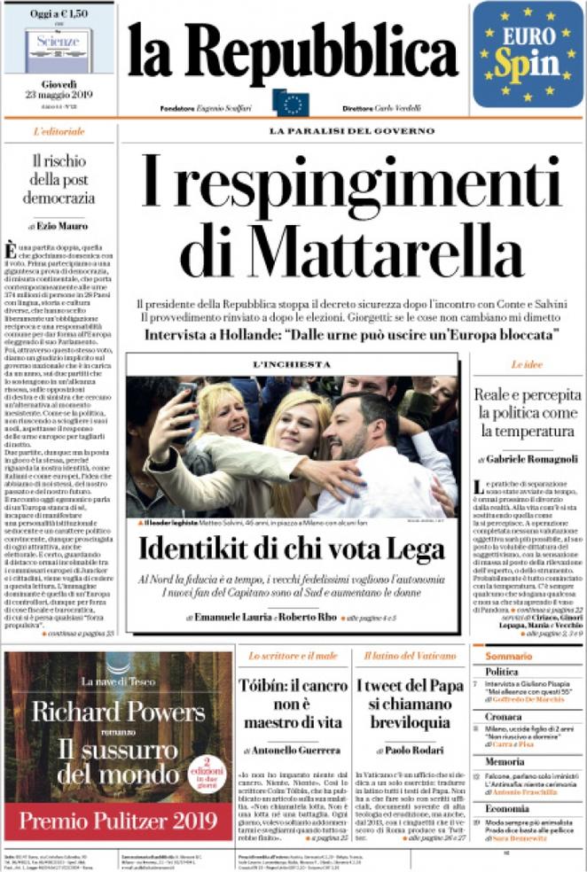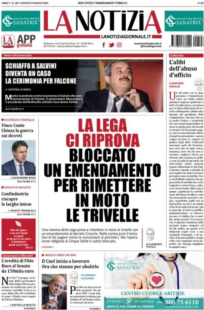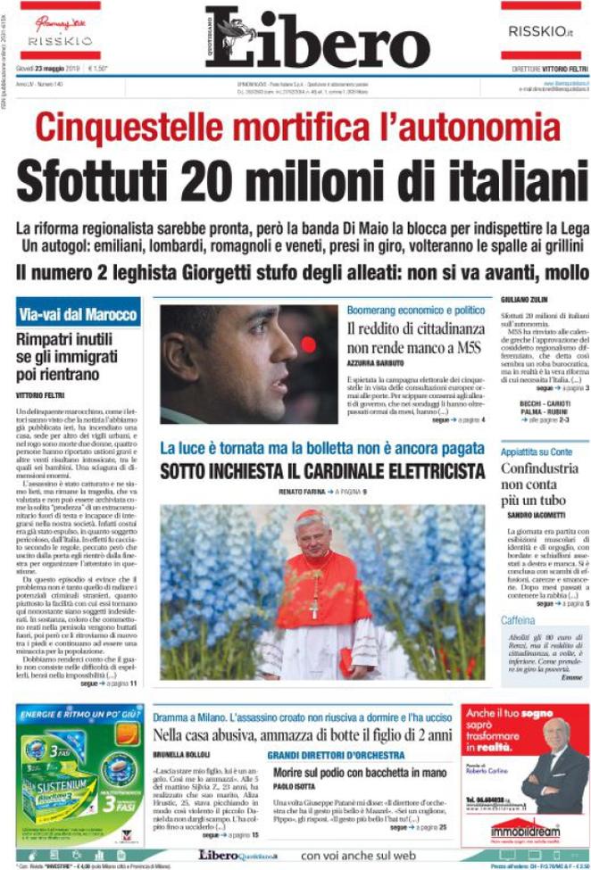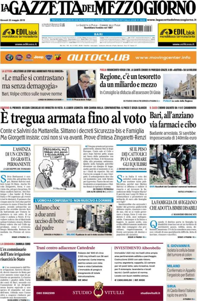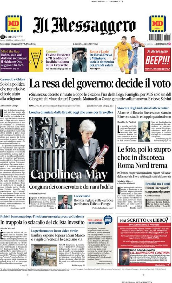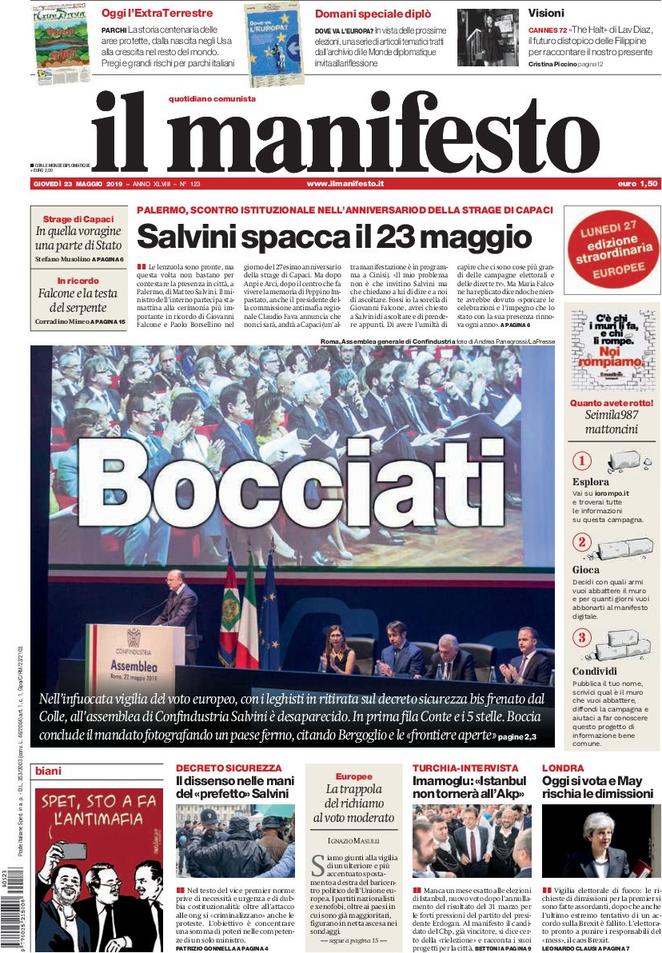 Rassegna delle prime pagine dei principali giornali italiani in edicola di oggi 23 maggio 2019