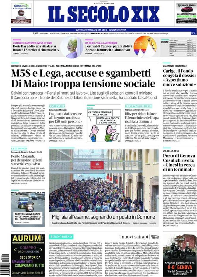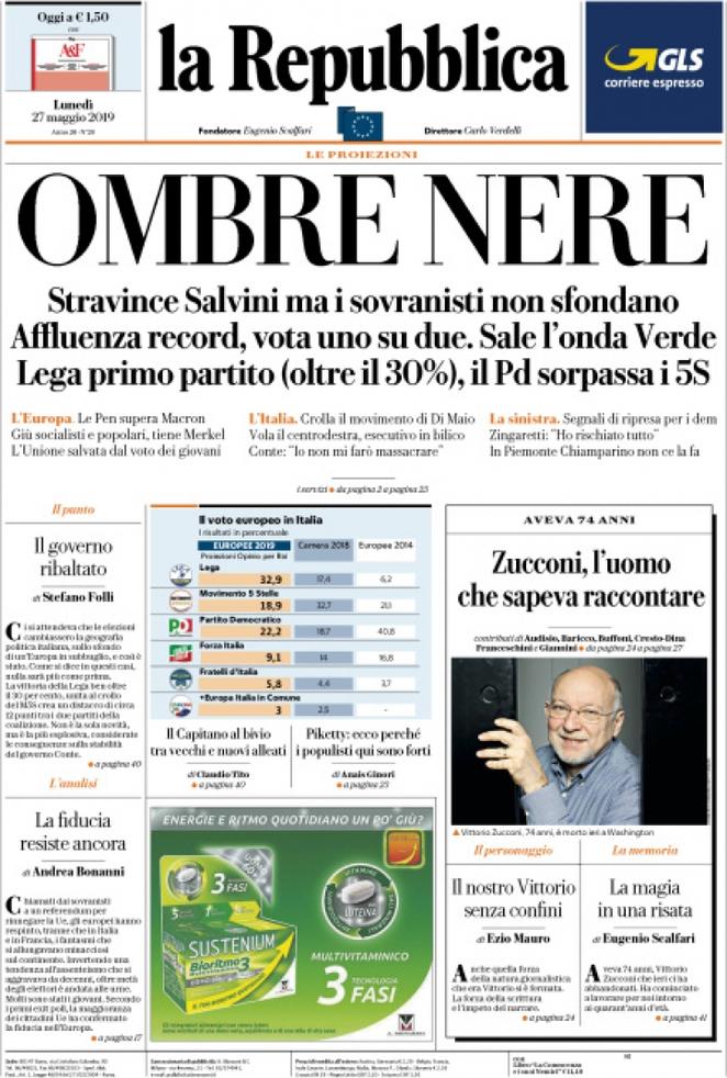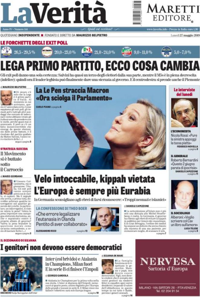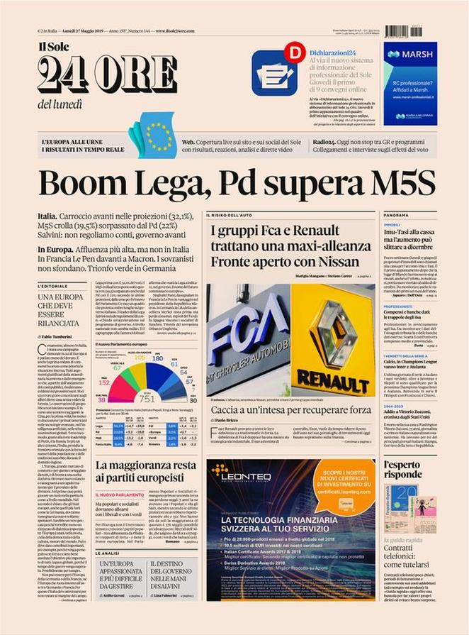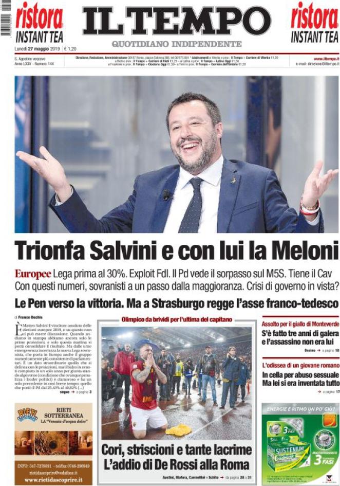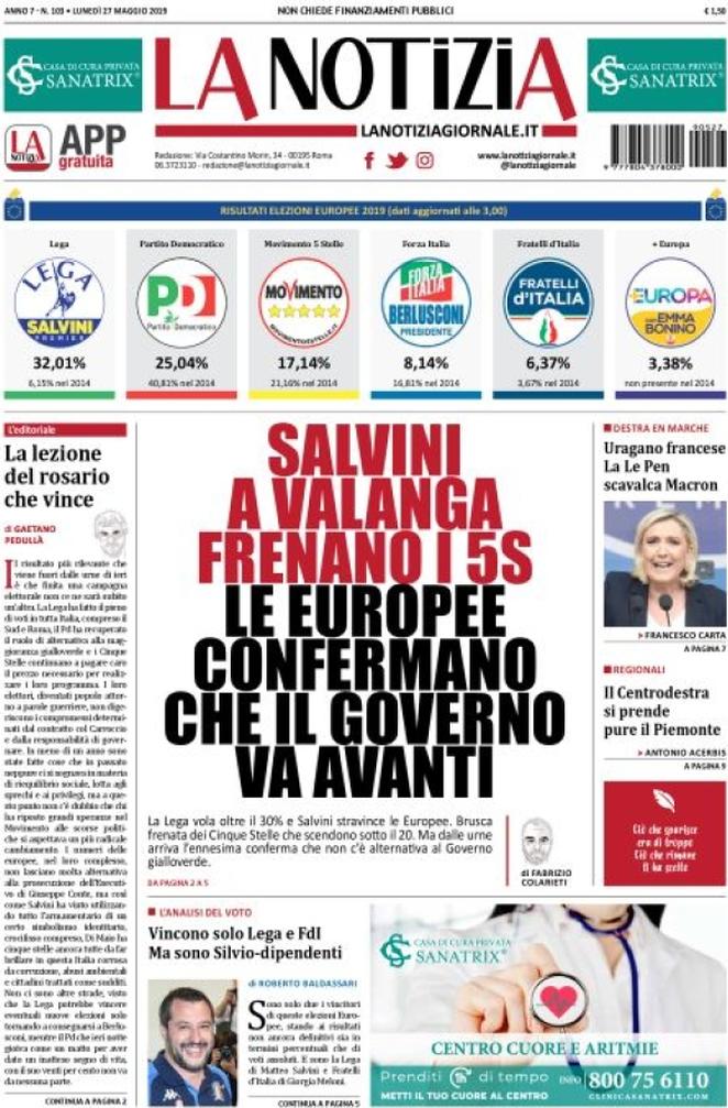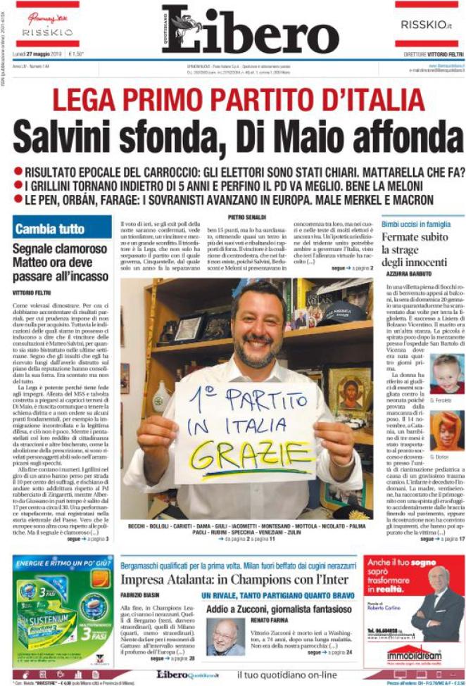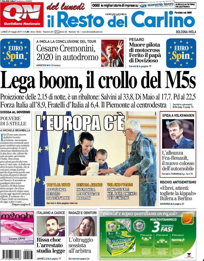 Rassegna delle prime pagine dei principali giornali italiani in edicola di oggi 27 maggio 2019