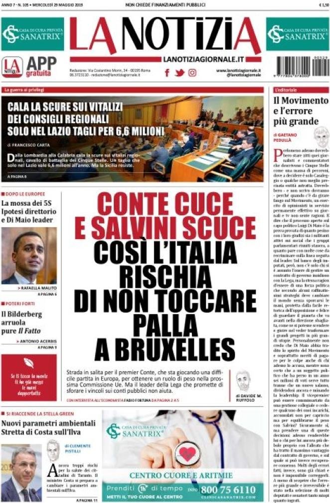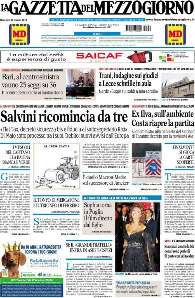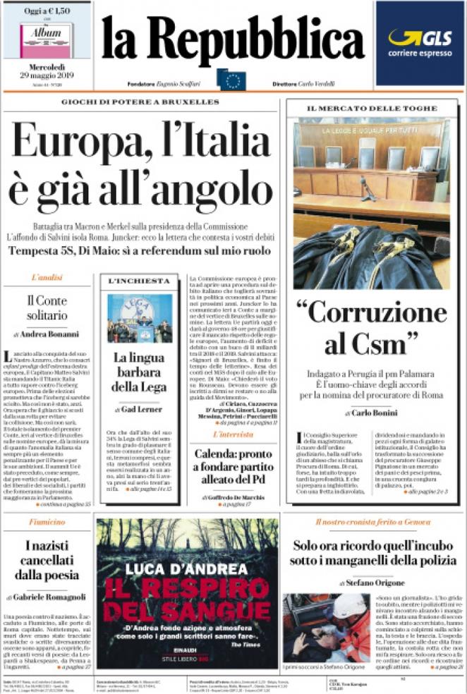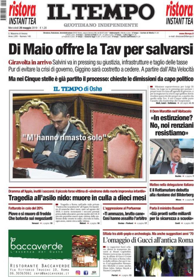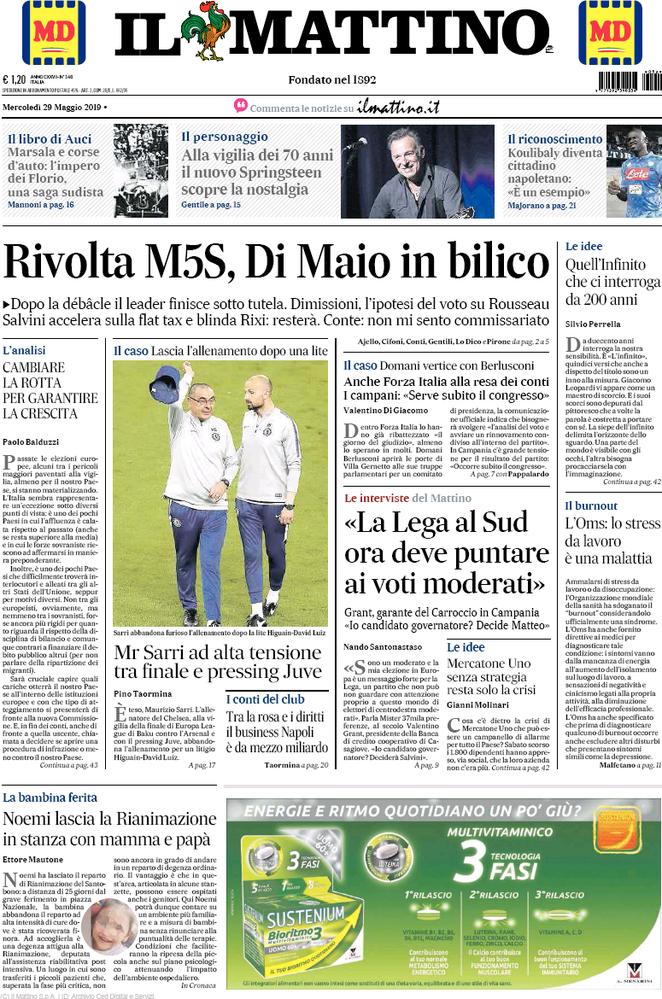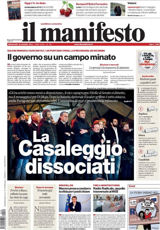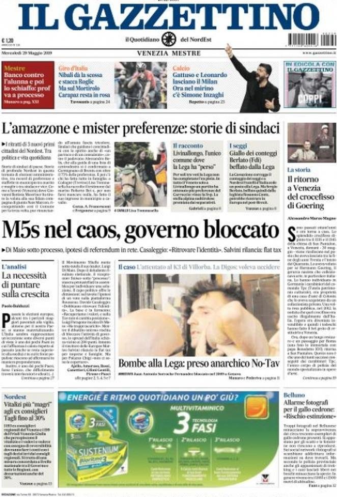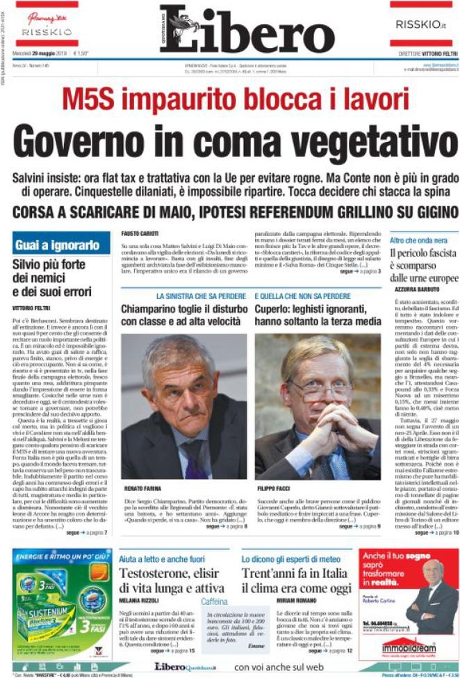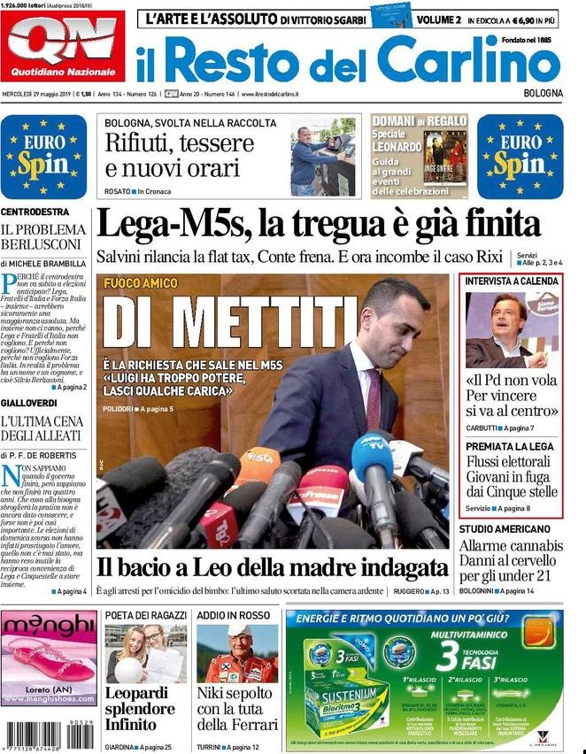 Rassegna delle prime pagine dei principali giornali italiani in edicola di oggi 29 maggio 2019