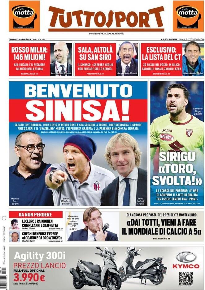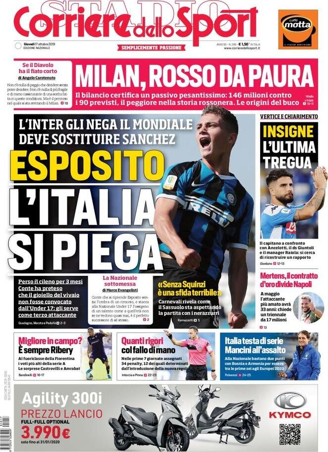 17 ottobre: prime pagine sport