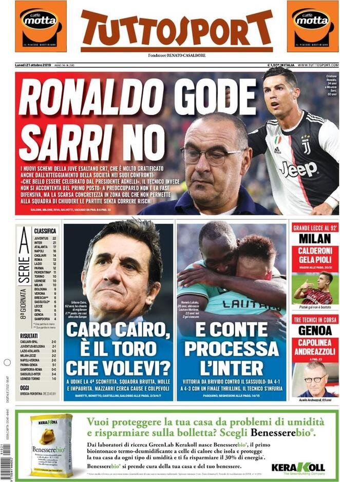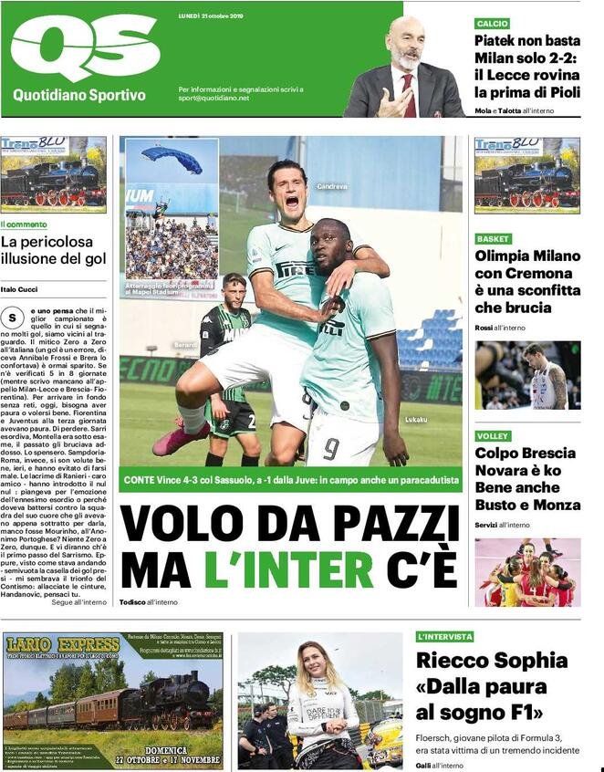 21 ottobre: prime pagine sport