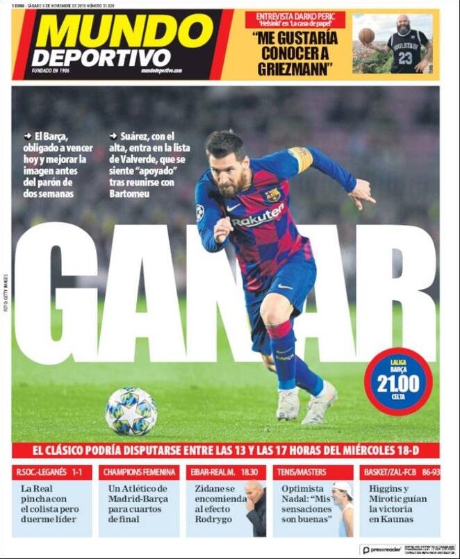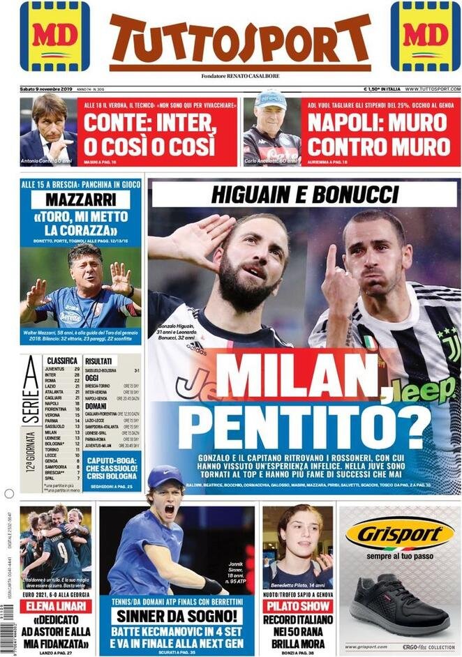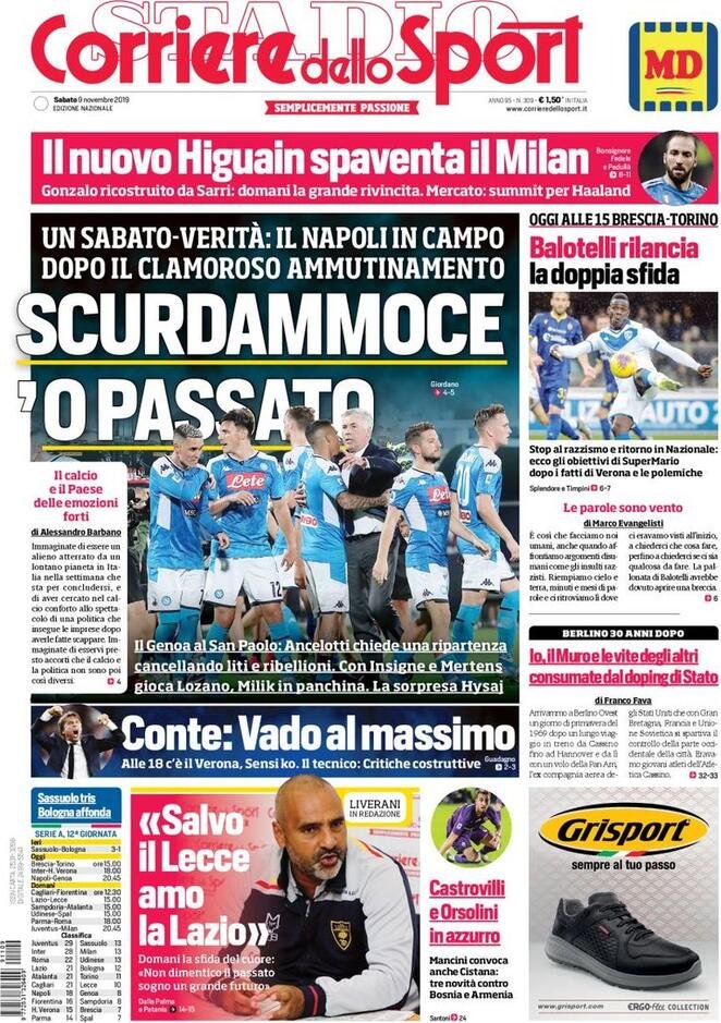 9 novembre: prime pagine sport