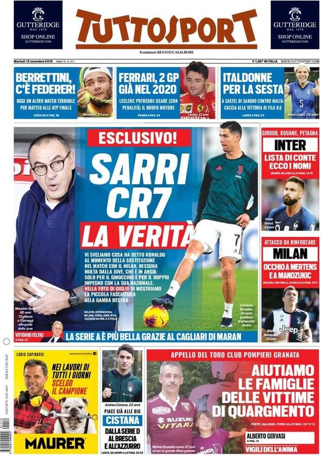 12 novembre: prime pagine sport