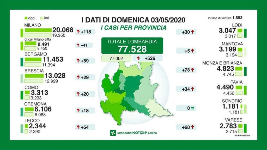 nelle ultime 24 ore si registrano 526 nuovi casi, 42 decessi e -13 in terapia intensiva. Nel riepilogo generale di domenica 3 maggio si legge inoltre il numero dei tamponi delle ultime 24 ore: 7.155 (per un totale di 410.857 nella regione), il totale di positivi al Covid-19 in Lombardia dall’inizio della pandemia: 77.528. I pazienti nelle terapie intensive della regione sono in tutto 532. I decessi totali sono 14.231. I dimessi in totale sono 52.773 (di cui nell’ultimo giorno 417).