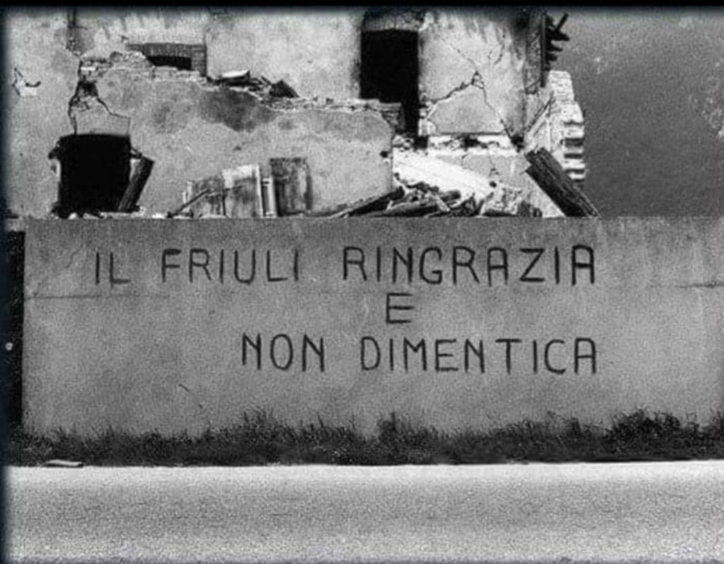 l’Orcolat (Orco della Carnia) causò 989 morti 3 mila feriti e 80 mila sfollati e in tutto il Friuli e in Italia “esplose” la solidarietà mobilitando i giovani che si recarono subito sui luoghi del disastro e i sindaci formarono squadre con gli alpini della “Julia” e i vigili del fuoco.