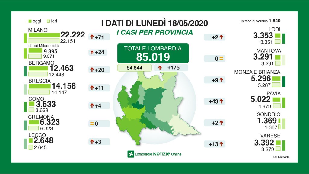 Anche oggi in regione Lombardia continua il calo dei ricoverati in terapia intensiva (-3) che ad oggi sono 252 e si registra un piccolissimo aumento dei ricoverati generici (2) il cui totale ora è di 4.482. In giornata sono stati effettuati circa 5 mila tamponi che hanno permesso di rilevare 175 nuovi casi che portano il totale a 85.019 e ci sono stati 24 decessi che portano il totale a 15.543. I nuovi guariti sono 873 e il totale è salito a 35.915.