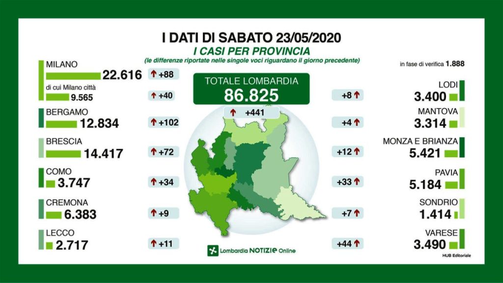 Anche oggi in regione Lombardia continua il calo dei ricoverati in terapia intensiva (-8) che ad oggi sono 199 e dei ricoverati generici (-2) il cui totale ora è di 4.026. In giornata sono stati effettuati circa 17 mila tamponi e il totale dei contagiati oggi è di 25.630 (-303). Il numero totale dall’inizio sale a 86.825 (+441) e oggi ci sono stati 56 morti che portano il totale 15.840 I nuovi guariti o dimessi sono 688 e il totale è salito a 45355.