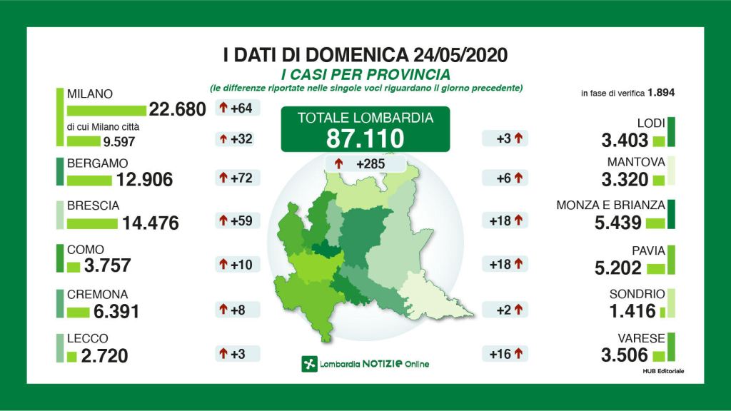 Nella giornata di oggi, domenica 24 maggio per quanto riguarda la voce decessi si specifica che i flussi provenienti dalla rete ospedaliera e le anagrafi territoriali oggi non hanno segnalato decessi. Continua il calo dei ricoverati in terapia intensiva (-2) che ad oggi sono 197 e dei ricoverati generici (-9) il cui totale ora è di 4.017. In giornata sono stati effettuati 11.457 tamponi (che portano il totale a 670.241) e il totale dei contagiati oggi è di 25.614 (-16). Il numero totale dall’inizio sale a 87.110 (+285) e oggi non sono stati segnalati decessi e il totale resta 15.840. I nuovi guariti o dimessi sono 301 e il totale è salito a 45.656.